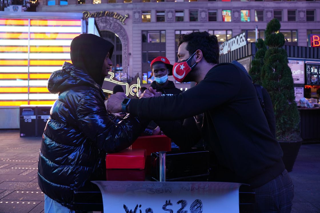 ~New York'taki Times Meydanı'na kurduğu bilek güreşi tezgahının önünde, etrafından geçen Amerikalı ve yabancı turistlere, "Beni yen, 20 doları kazan" diyerek çağrı yapan Türk vatandaşı Volkan Kırımlıoğlu, kendisiyle bilek güreşi yapmayı kabul eden Amerikalıları tek tek yendi.