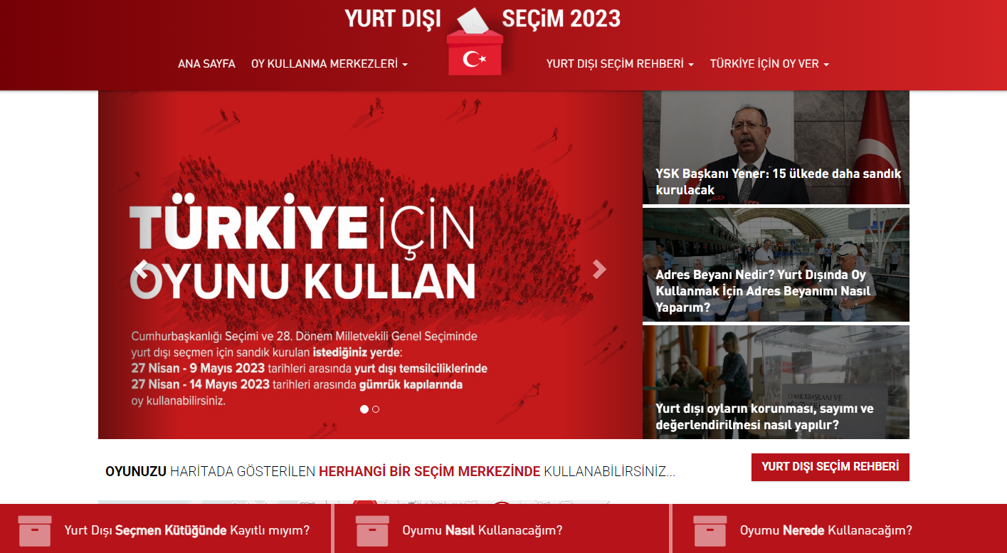 Yurtdışı Türkler ve Akraba Topluluklar Başkanlığı (YTB) tarafından yurt dışı seçmen kütüğüne kayıtlı vatandaşların rahat bir şekilde oy kullanabilmeleri için hazırlanan ve her seçim döneminde yayınlanan “secim.ytb.gov.tr” adresli internet sitesi önümüzdeki seçimler için de hizmete açıldı. Vatandaşların oy verme işlemini kolaylaştıracak bilgilerin bulunduğu internet sitesinde seçim rehberinden Yüksek Seçim Kurulu kararlarına, sandık kurulacak ülke bilgilerinden adres beyan formuna kadar birçok önemli ayrıntı yer alıyor.