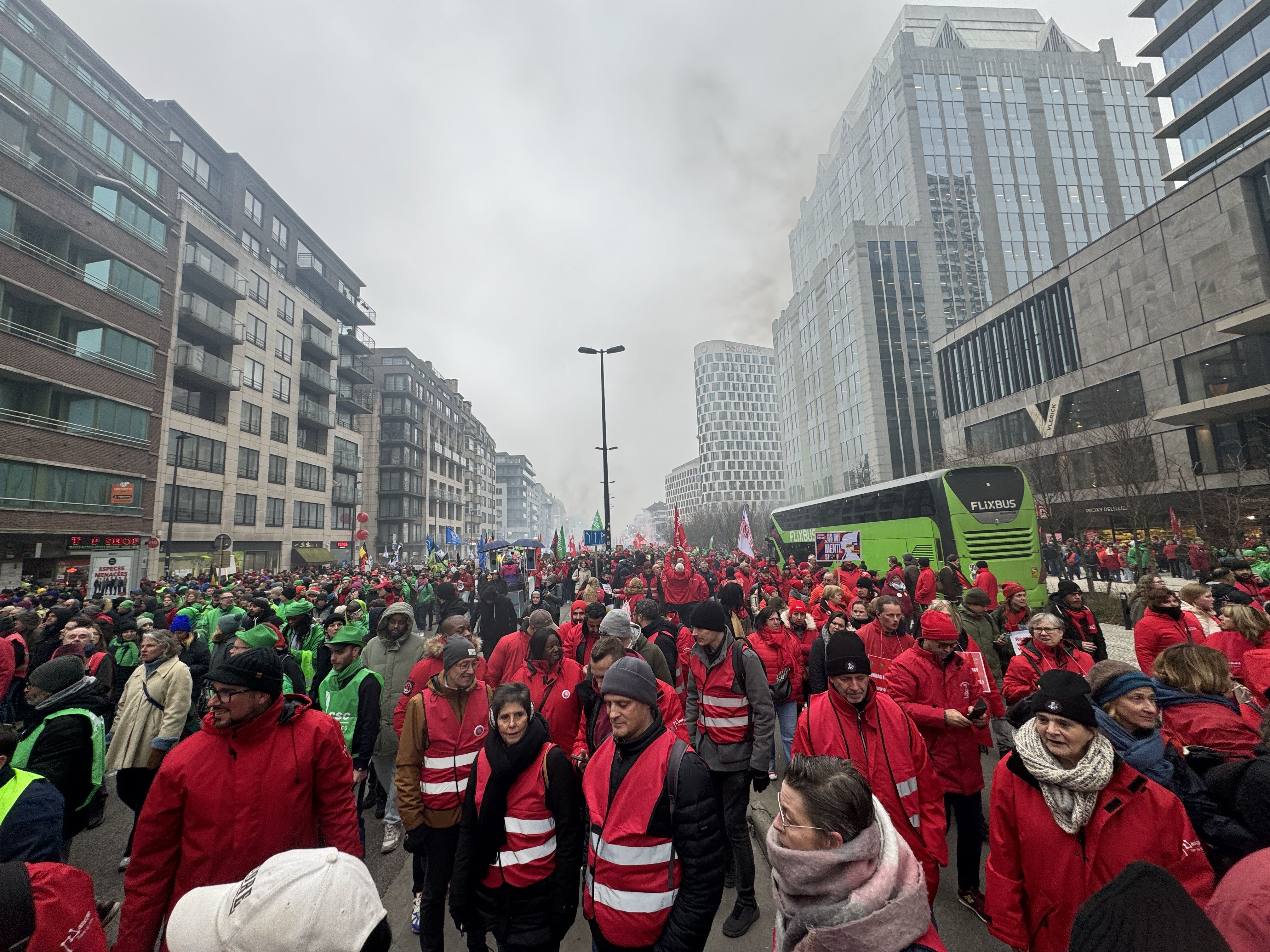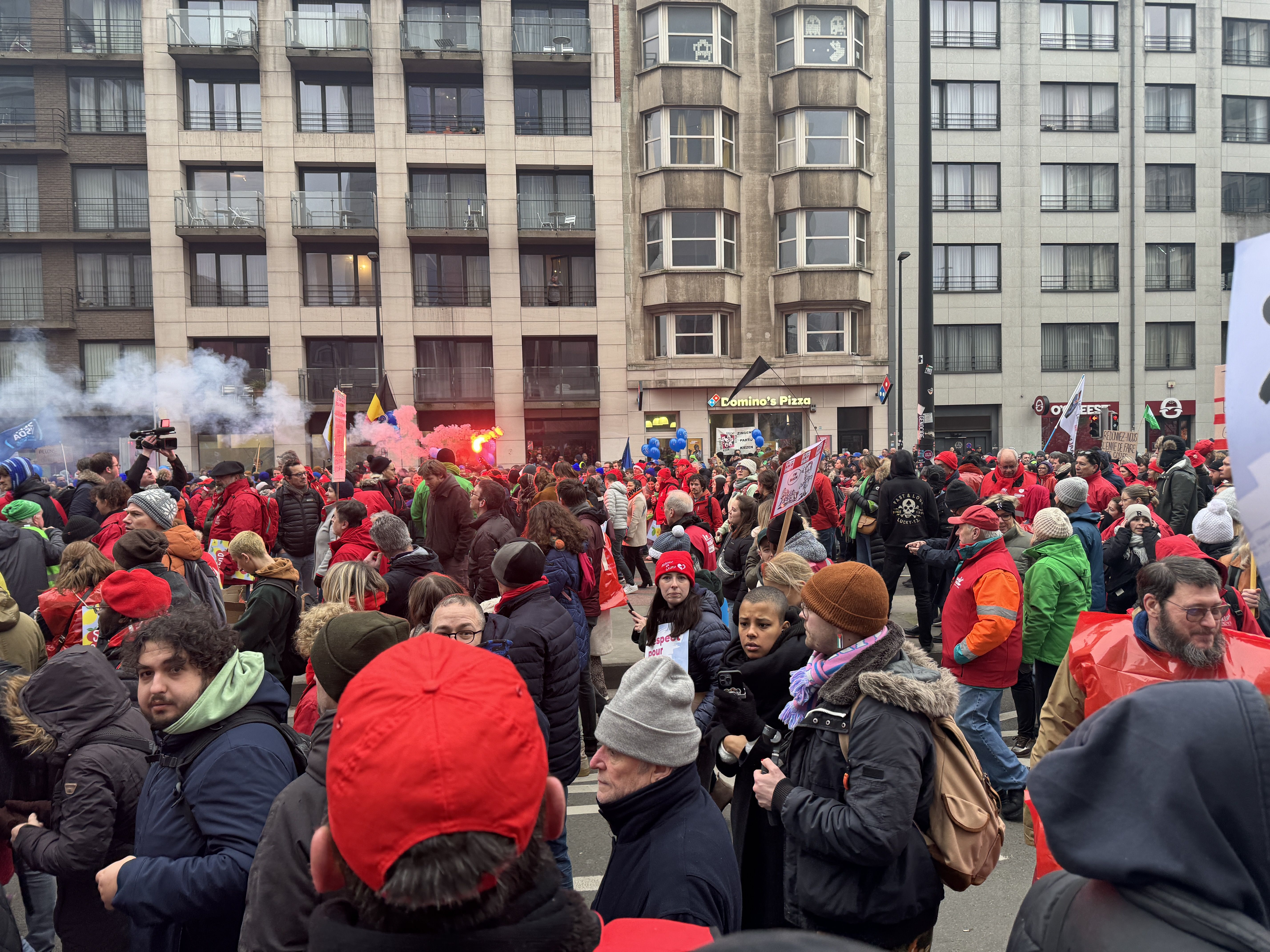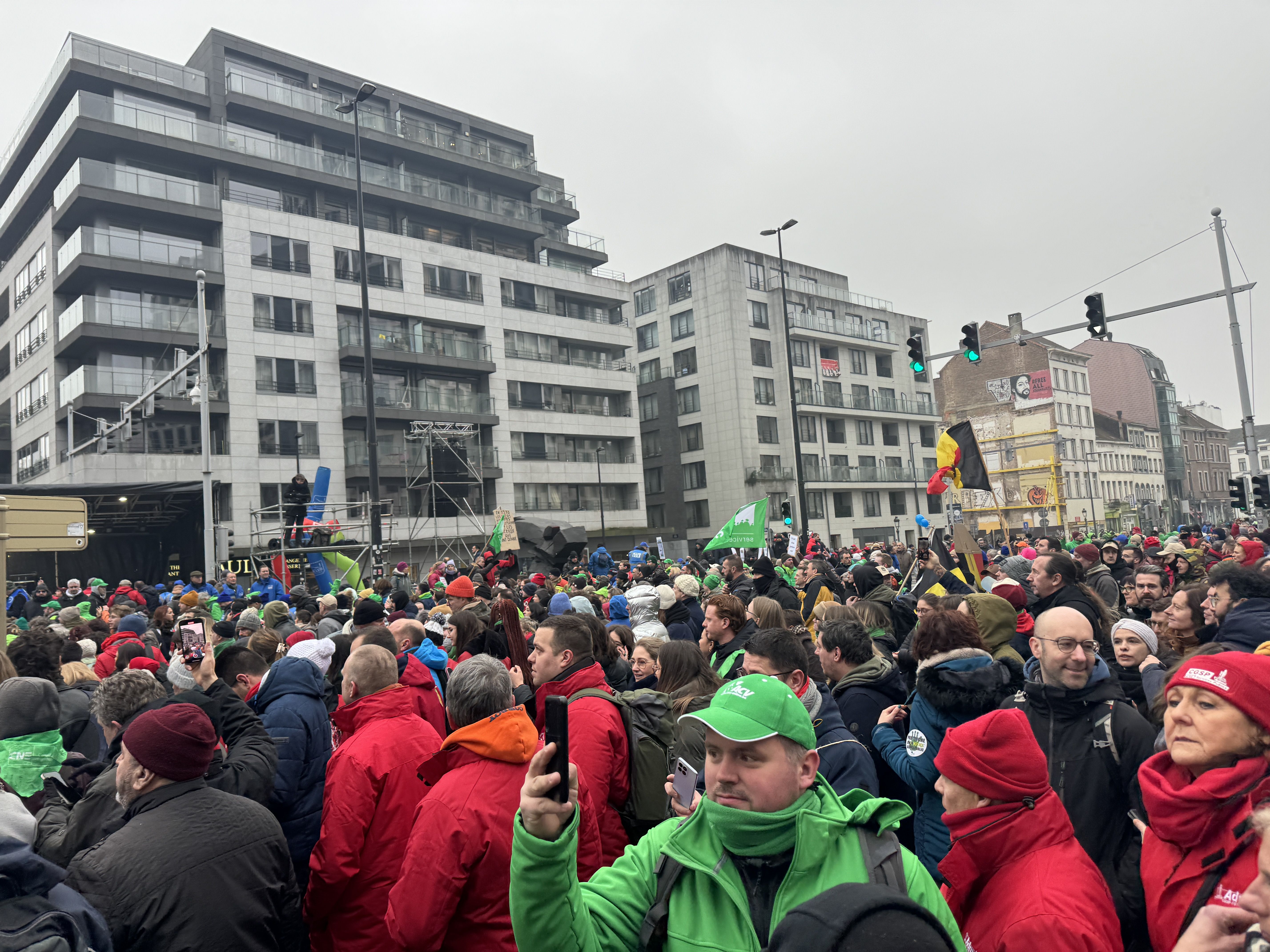 Belçika'daki bütün işçi sendikalarının çağrısı üzerine yaklaşık 60 bin kişi, Brüksel'in merkezindeki Kuzey Tren İstasyonu önünde bir araya geldi.