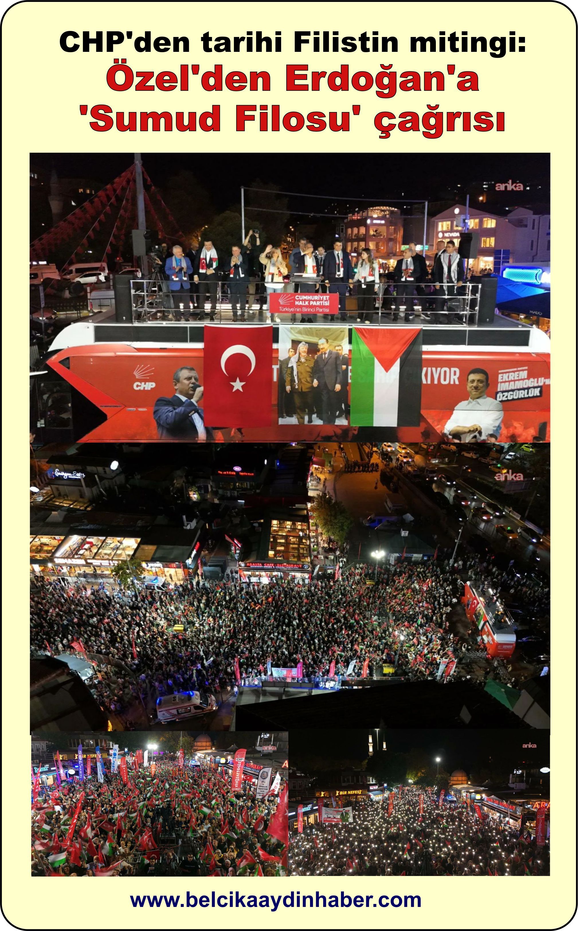 CHP’nin cumhurbaşkanı adayı Ekrem İmamoğlu’nun tutuklanmasının ardından her hafta çarşamba günleri İstanbul’un bir ilçesinde, her hafta sonu ise Türkiye’nin farklı illerinde düzenlediği "Millet İradesine Sahip Çıkıyor" mitingleri bu hafta Filistin'e destek olmak amacıyla "Özgür Filistin, Tam Bağımsız Türkiye" sloganı ile Eyüpsultan ilçesinde düzenlendi. CHP Genel Başkanı Özgür Özel, kalabalığa seslendi. Cumhurbaşkanı Erdoğan'a çağrıda bulunan Özel, "Bugün tarihin doğru tarafında olmaya katliamın karşısında olmaya geldik. Sumud filosu Girit açıklarında saldırıya uğradı. Buradan Erdoğan'a sesleniyorum, o filoya sahip çıkın, koruyun ne olursa olsun!" dedi.