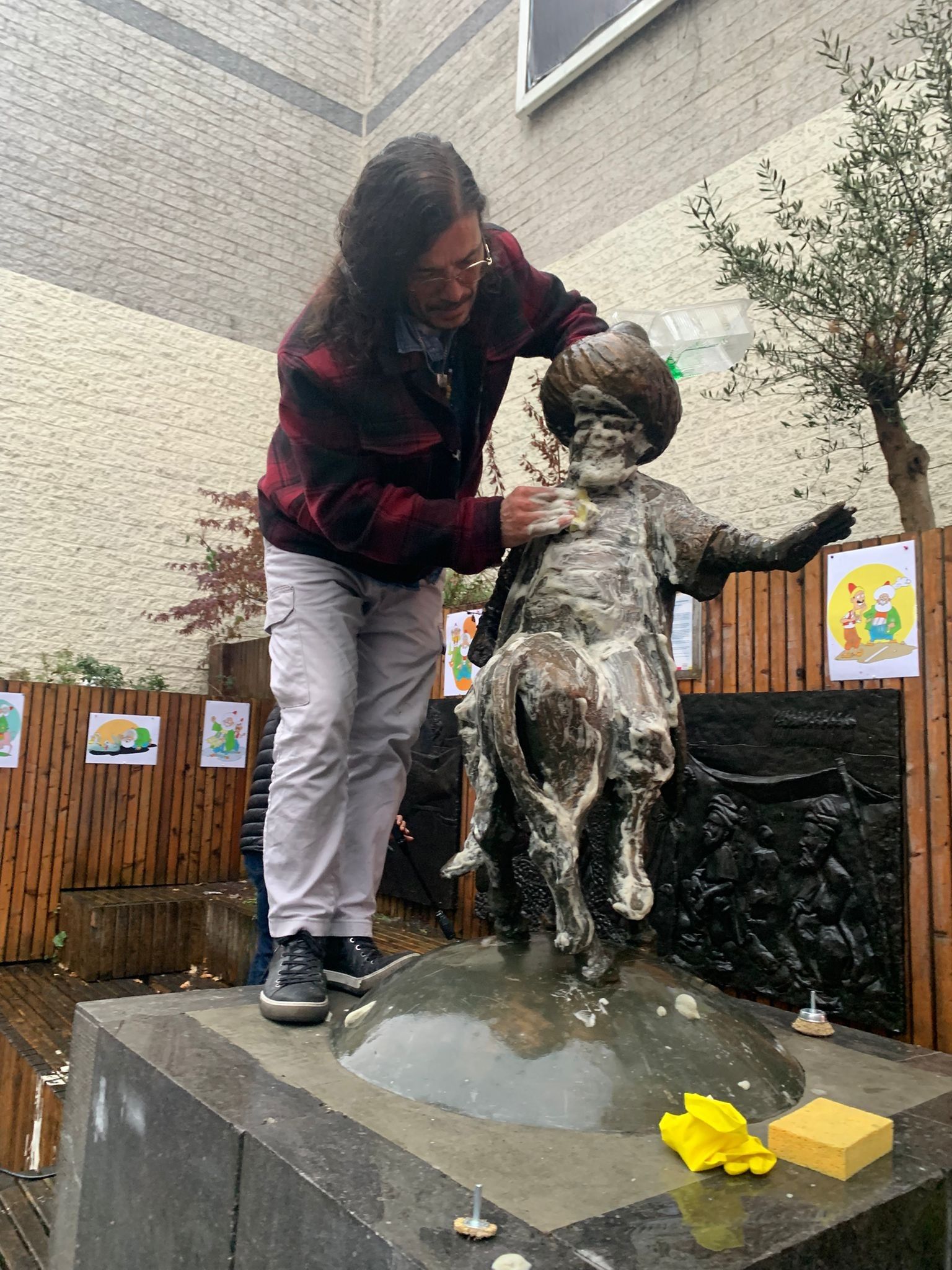 3 Ekim Dünya Gülmece Günü’nde Belçikalı Türkler, mizah yazarı Erdinç Utku’nun çağrısıyla Nasrettin Hoca heykelinin çevresini temizledi. Çocukların katılımı etkinliğe renk kattı.