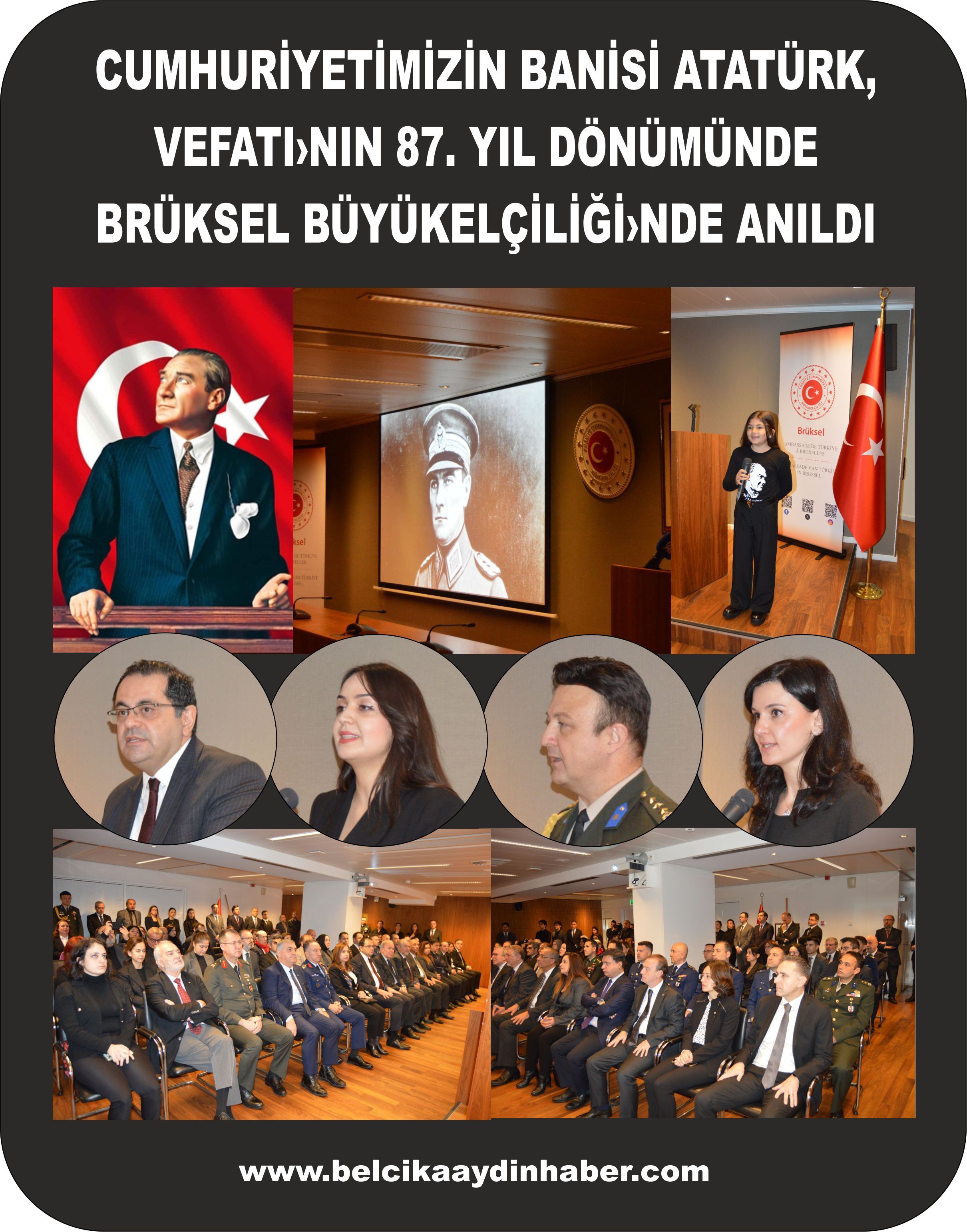 Türkiye Cumhuriyeti'nin kurucusu Büyük Önder Mustafa Kemal Atatürk, ebediyete intikalinin 87. yılında, Avrupa'daki temsilciliklerde törenle anıldı. Türkiye'nin Brüksel Büyükelçiliğinde Büyükelçi Barış Tantekin'in ev sahipliğinde yapılan tören, Atatürk ve silah arkadaşlarının anısına saygı duruşu ve İstiklal Marşı'yla başladı.