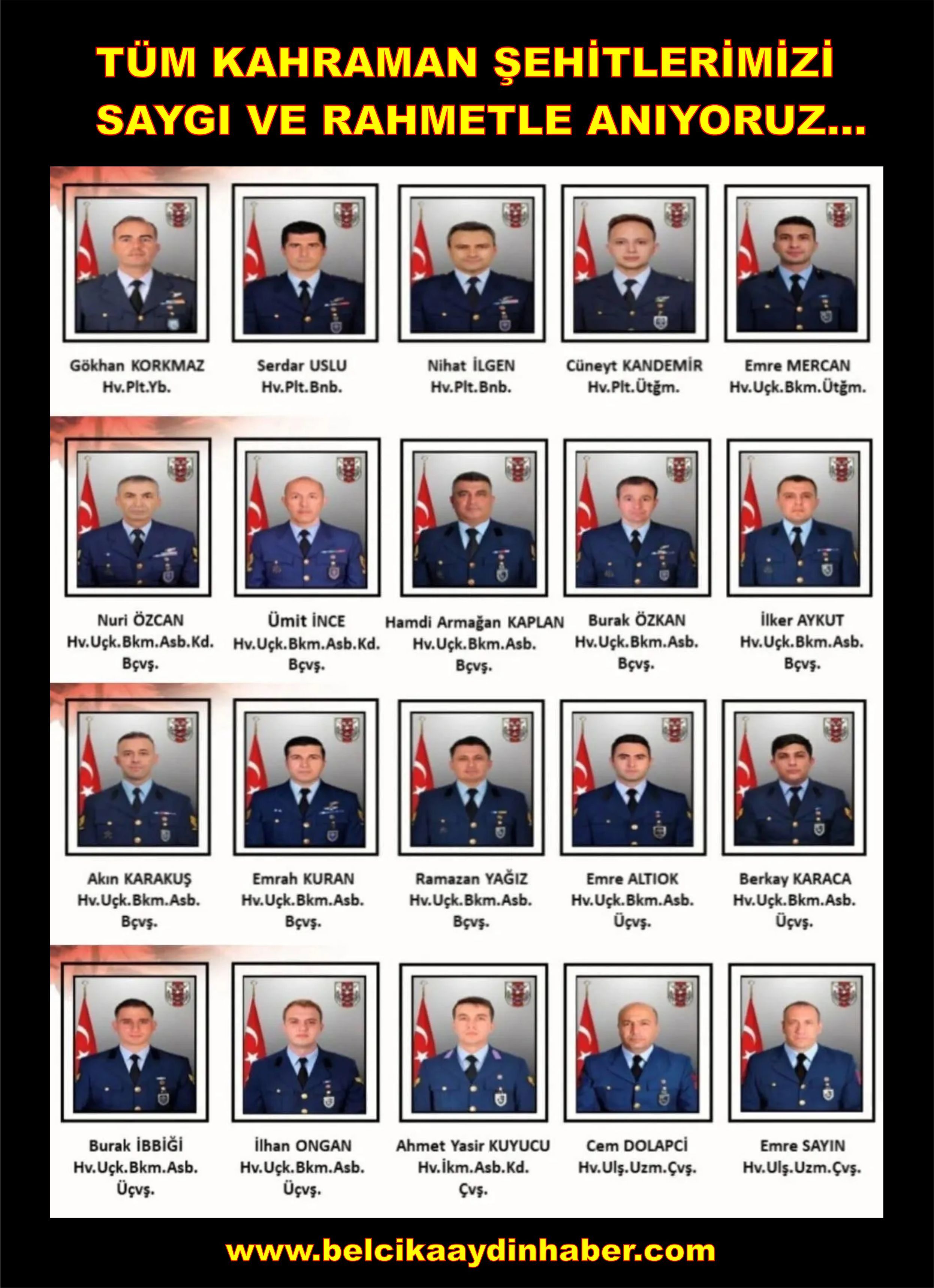 "Hava Pilot Yarbay Gökhan Korkmaz, Hava Pilot Binbaşı Serdar Uslu, Hava Pilot Binbaşı Nihat İlgen, Hava Pilot Üsteğmen Cüneyt Kandemir, Hava Uçak Bakım Üsteğmen Emre Mercan, Hava Uçak Bakım Astsubay Kıdemli Başçavuş Nuri Özcan, Hava Uçak Bakım Astsubay Kıdemli Başçavuş Ümit İnce, Hava Uçak Bakım Astsubay Başçavuş Hamdi Armağan Kaplan, Hava Uçak Bakım Astsubay Başçavuş Burak Özkan, Hava Uçak Bakım Astsubay Başçavuş İlker Aykut, Hava Uçak Bakım Astsubay Başçavuş Akın Karakuş, Hava Uçak Bakım Astsubay Başçavuş Emrah Kuran, Hava Uçak Bakım Astsubay Başçavuş Ramazan Yağız, Hava Uçak Bakım Astsubay Üstçavuş Emre Altıok, Hava Uçak Bakım Astsubay Üstçavuş Berkay Karaca, Hava Uçak Bakım Astsubay Üstçavuş Burak İbbiği, Hava Uçak Bakım Astsubay Üstçavuş İlhan Ongan, Hava İkmal Astsubay Kıdemli Çavuş Ahmet Yasir Kuyucu, Hava Ulaştırma Uzman Çavuş Cem Dolapci, Hava Ulaştırma Uzman Çavuş Emre Sayın"