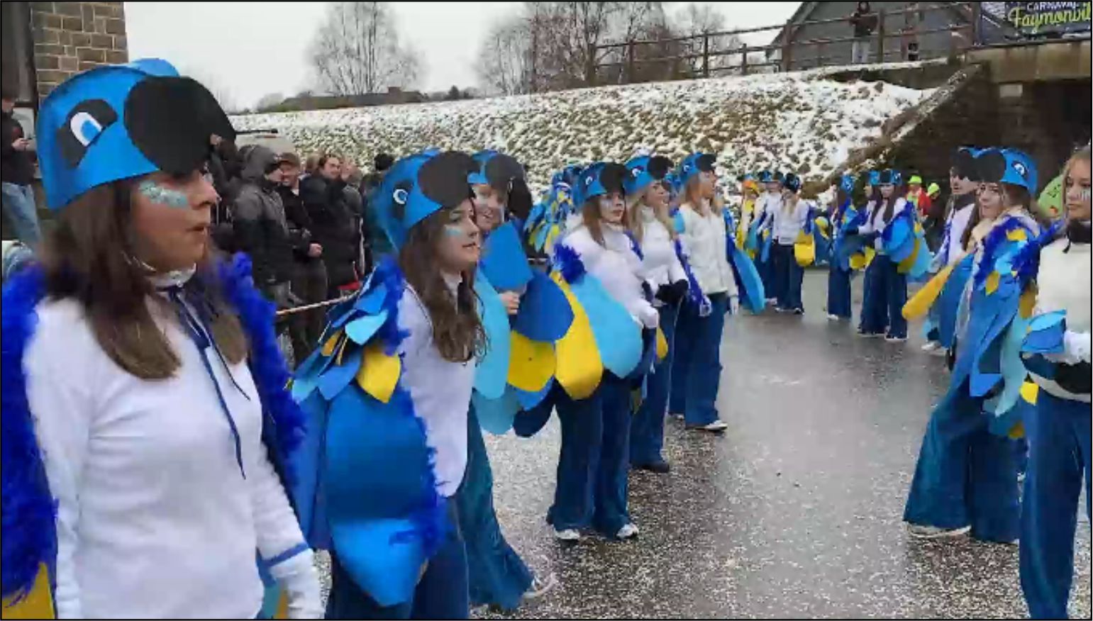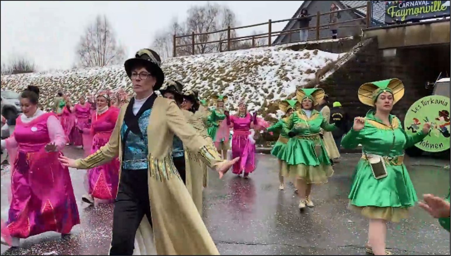 Büyük geçit töreninin başlamasından sadece birkaç dakika önce yaşanan değişken ve karlı havaya rağmen, 20 araçlık geçit töreninin tamamı bu öğleden sonra Faymonville'deydi. Elbette, bu yıl Harry Potter temalı Türk geçit töreni de vardı, ancak geçit törenindeki tek araçlar kesinlikle onlar değildi. Karnaval komitesinin bir üyesi olan Norbert Georges, "Bu eşsiz bir karnaval," demeyi seviyor. "Zihniyet açısından bile, Malmedy, Valon ve Alman etkilerinin bir karışımına sahibiz. Karnaval Prensi'miz yok ve geçit töreni büyük ölçüde çevre köylerden gelen gruplardan oluşuyor. Karnavalımızı bu kadar özgün kılan da bu."