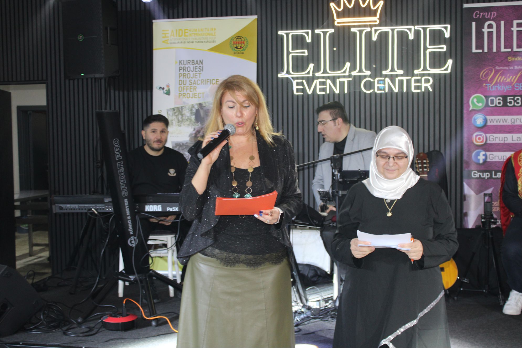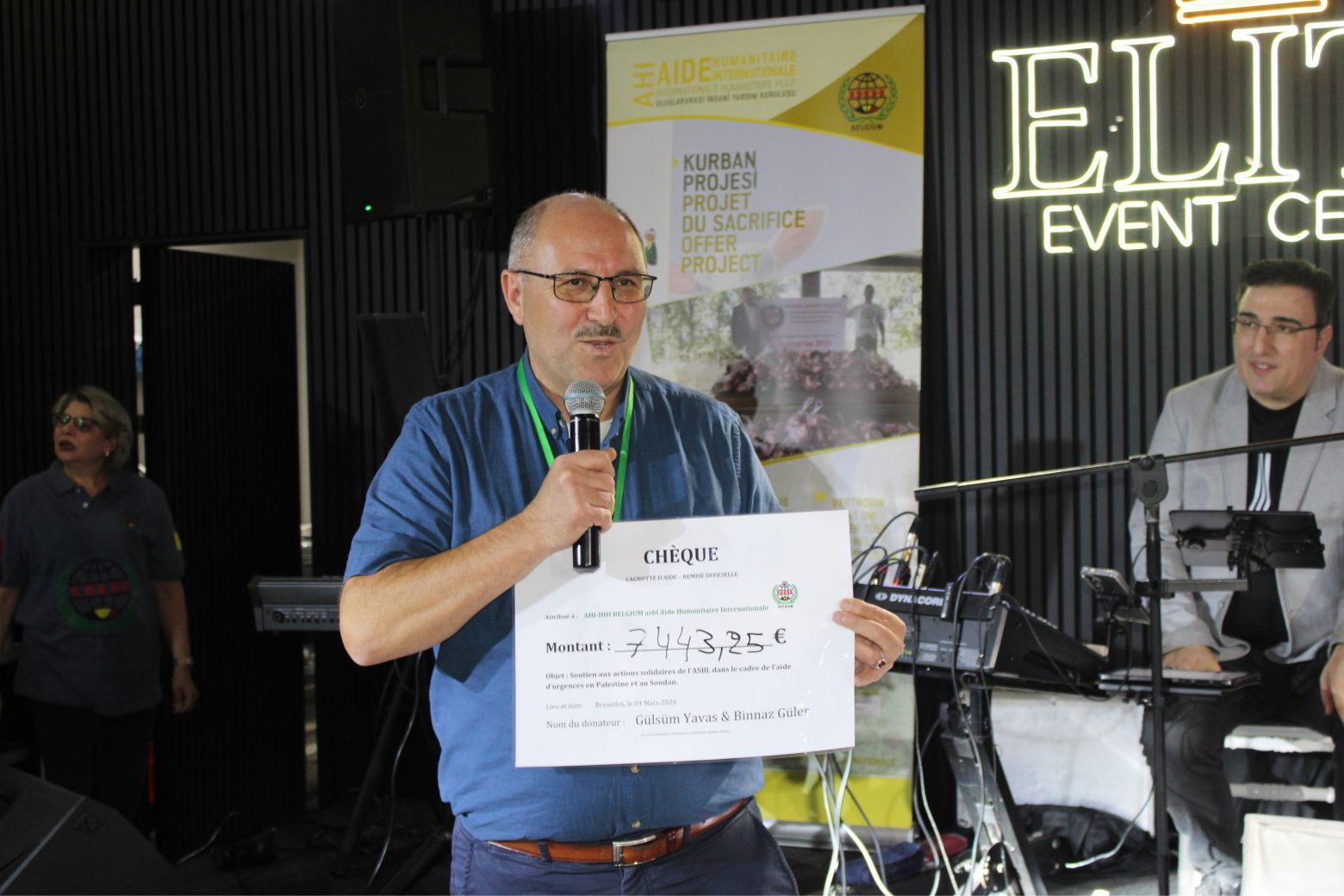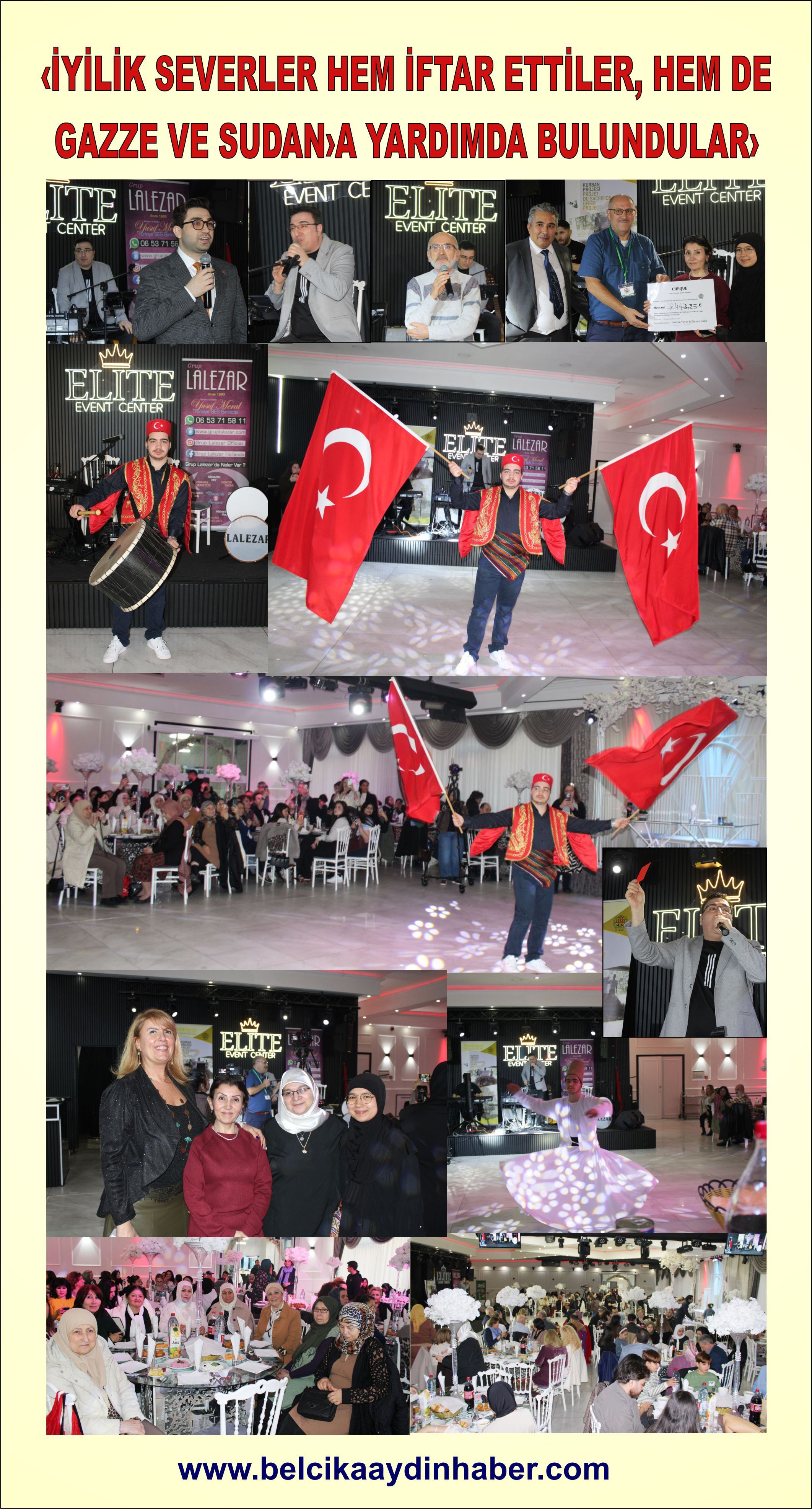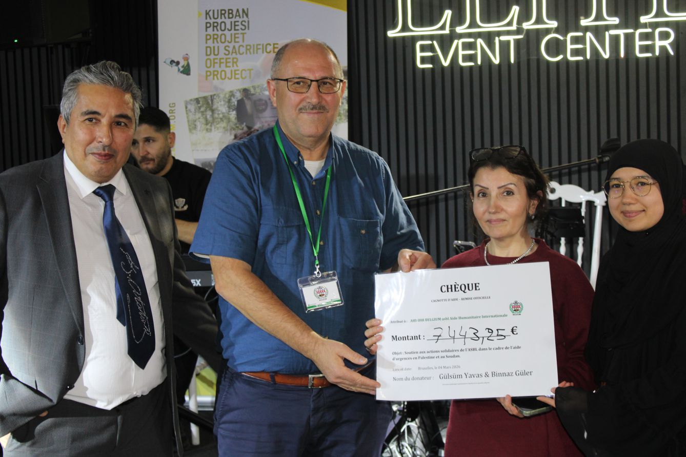 Gecede Gazze ve Sudan’ için toplanan 7443,25 euro Çek,(Yedibindörtyüzkırküç Euro yırmıbeş cent) Organizatörler Gülsüm Yavaş ve Binnaz Güler tarafından, Belçika İHH İnsani Yardım Vakfı Başkanı Selahattin Koç’a teslim edildi.
