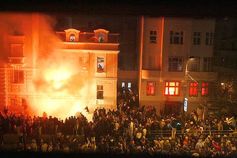 İşte Dünyayı ayağa kaldıran görüntü Kosova'nın bağımsızlığını protesto eden göstericiler, Sırbistan'ın başkenti Belgrad'daki ABD Büyükelçiliği'ne saldırdı. Olaya müdahele eden jandarma göstericileri dağıttı. Sırp fanatikler, ABD elçiliğini yakıp Türk elçiliğindeki bayrağı indirdi Kosova'nın bağımsızlığına en büyük desteği verdiği için Sırplar'ın büyük tepkisine neden olan ABD'nin Belgrad Büyükelçiliği'ne giren maskeli saldırganlar, bürolardaki mobilyaları dışarı atmaya çalıştı ve odalarda yangın çıkardı. Kosova'nın Sırbistan'dan bağımsızlığını ilan etmesinin ardından hafta başında kapatılan büyükelçiliğe giren saldırganlara zırhlı araçlarla bölgeye gelen jandarmalar müdahale etti. Jandarma, kalabalığın üzerine onlarca gözyaşartıcı bomba attı. Ara sokaklara kaçan göstericilerin, yer yer jandarmayla çatışmaya girdiği de kaydediliyor. Bu arada aynı saldırganların, ABD Büyükelçiliği'ne komşu Hırvatistan Büyükelçiliği'ne de saldırdıkları bildiriliyor. Ãte yandan itfaiyecilerin, ABD Büyükelçiliği'ndeki yangına müdahele ederek söndürdükleri kaydedildi. ABD Dışişleri Bakanlığı Sözcüsü Sean McCormack da saldırıdan sonra yaptığı açıklamada, Sırp hükümetinden, ABD Büyükelçiliği'ni korumasını istedi.