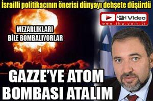 İsrailli parlamenter Avigdor Lieberman, Gazze'ye atom bombası atılmasını istedi İsrail'de yayınlanan Jerusalem Post gazetesinin haberine göre, aşırı sağcı siyasetçisi Lieberman, Hamas iktidarda olduğu müddetçe İsrail'in güvende olamayacağını söyledi ve kente atom bombası atılmasını istediğini ima etti. "Hamas'a karşı ABD'nin II. Dünya Savaşı'nda Japonya'ya yaptığını yapalım" diyen Lieberman, "Gazze'yi işgal etmek gereksiz" dedi. İsrail Beyteynu Partisi'nden parlamento üyesi olan Lieberman'ın bir önceki icraatı, Arapları temsil eden partinin seçimlere girmesinin engellenmesi olmuştu. Lieberman'ın dehşet verici açıklamasını benimseyen çok sayıda devlet görevlisi olduğunu belirtiliyor. İsrail artık ölüleri bile bombalıyor Gazze Şeridi'ne yönelik 3 haftadır süren operasyon devam ederken, İsrail bugün mezarlıkları bombaladı. Yetkililer 19'uncu gününe giren saldırılarda 947 kişinin hayatını kaybettiğini ve ölenlerin yaklaşık yarısının çocuklar ve kadınların oluşturduğunu açıkladı İHA