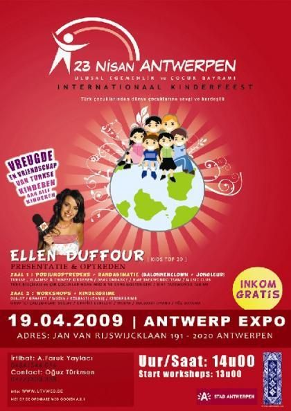 Türk Dernekler Birliği ve Anvers Türkçe ve Türk Kültürü dersleri öğretmenlerinin düzenlediği â23 Nisan Ulusal Egemenlik ve Ãocuk Bayramıâ kutlamarı bu yıl 19 Nisan Pazar günü ANTWERP EXPOâda gerçekleşecek. Flaman çocuk programcısı ELLEN DUFFOURâun sunacağı etkinlikte Türk çocuklarından folklör, şiir, skeç ve dans gösterilerinin yanı sıra, Ãin ejderha gösterisi, Flaman çocuk grubu, Brüksel BIAF Taekwondo takımı ve İsmail Erdoğdu önderliğinde Beringen Music Club sahnede gösterileriyle şenliğe renk katacaklar. İkinci salonda ise yüz boyama ve küçük gruplar halinde çalışmalar yapılacak. Bu çercevede Deejay, Grafiti yapımı, medya (reportaj), Kolbastı oyunu, ve Rap müziği işlikleri (atölye) düzenlenecek. 23 Bayramı ise saat 14.00âde başlıyor. Türk Dernekler Birliği öncülüğünde düzenlenen etkinlik Türkçe ve Türk Kültürü dersleri öğretmenleri, Anvers Zuid Mehmet Akif Camii, Anvers Noord İmam-I Buhari Camii, Anvers Hoboken Hacı Bayram Camii ve Anvers Berchem Selimiye Camii işbirliği ile gerçekleştiriliyor.