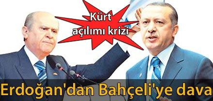 AK Parti, Hükümetin Kürt açılımını sert sözlerle eleştiren MHP Genel Başkanı Devlet Bahçeli'ye iki ayrı dava açıyor. Yorum Yaz Yazdır Eksenim'e Ekle Facebook Twitter Del.icio.us Arkadaşına gönder RSS SMS Servisi Stumbleupon Friendfeed DiggBaşbakan Erdoğan, Kürt açılımını sert sözlerle eleştiren MHP Genel Başkanı Devlet Bahçeli'ye iki ayrı dava açıyor. Ak Parti'nin avukatları MHP lideri Bahçeli'nin açıklamalarını inceleme altına aldı. İnceleme sonunda Bahçeli'ye iki ayrı dava açılmasına karar verildi. Davalardan biri Ak Parti'nin tüzel kişiliği, diğeri de Başbakan Erdoğan adına açılacak.