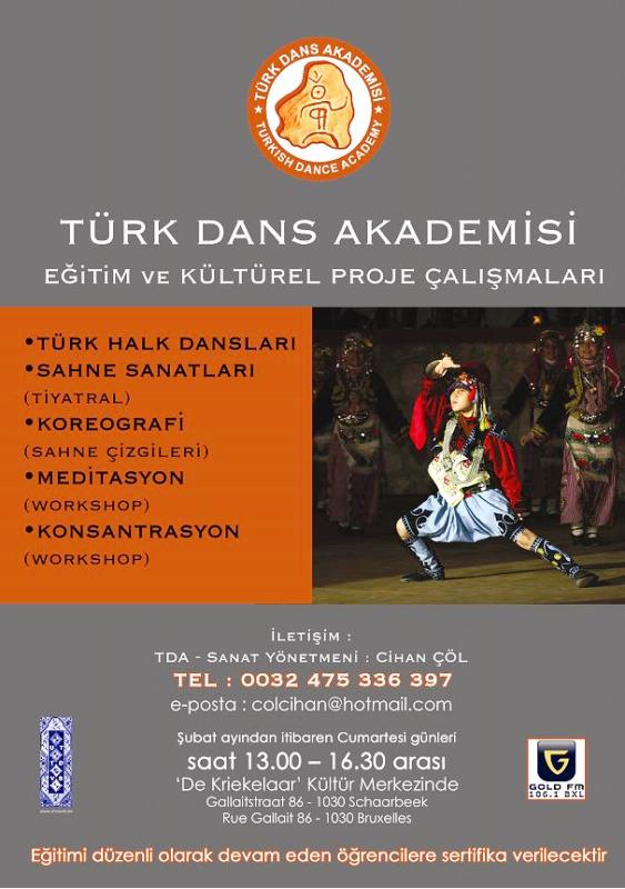 Dans eğitimi Kriekelaar Kültür Merkezi ( Rue Gallait – Gallaitstraat n° 86 – 1030 Brüksel ) adresinde her Cumartesi saat 13 – 16.30 arasι gerçekleşecektir .