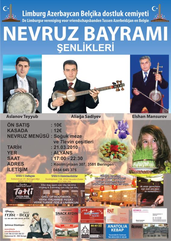 Belçika Limburg Azerbaycan Belçika Dostluk Cemiyeti tarafından yakınlaşan Nevruz Bayramı (Bahar) nedeniyle bir ‘Nevruz Bayramı Şenliği’ düzenlenmekte.
