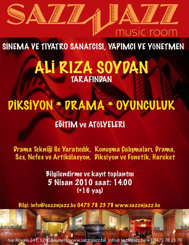 SAZZ'N JAZZ DA SİNEMA VE TİYATRO SANATÇISI ALİ RIZA SOYDAN YÖNETİMİNDE 5 NİSAN CUMARTESİ GÜNÜ YAPILACAK BİLGİLENDİRME TOPLANTISINDAN SONRA BAŞLIYOR...
