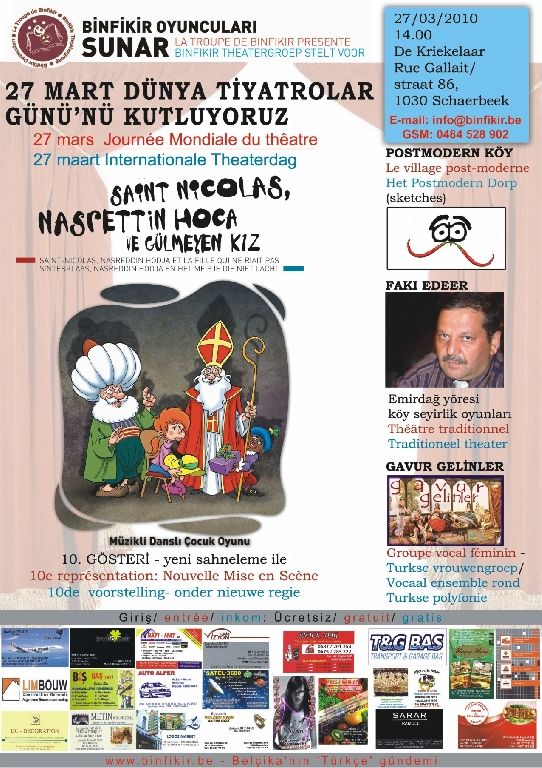 La Troupe de Binfikir, qui a commencé ses activités en 2008 avec les élèves de l’Ecole de Théâtre de l’asbl Binfikir, célèbre la Journée Mondiale du Théâtre ce 27 Mars à Bruxelles. Outre notre première production propre, la pièce de théâtre musicale et dansante pour enfants « Saint Nicolas, Nasreddin Hodja et la fille qui ne riait pas » qui sera présentée avec la nouvelle mise en scène de Cüneyt Tamoğulları, nous présenterons de sketches écrits et joués par nos élèves ainsi que le concert du groupe « Gavur Gelinler » emmené par l’artiste bruxelloise Sibel Dinçer. Le troubadour anatolien Faki Edeer présentera aux spectateurs le théâtre traditionnel de la région d’Emirdag.
