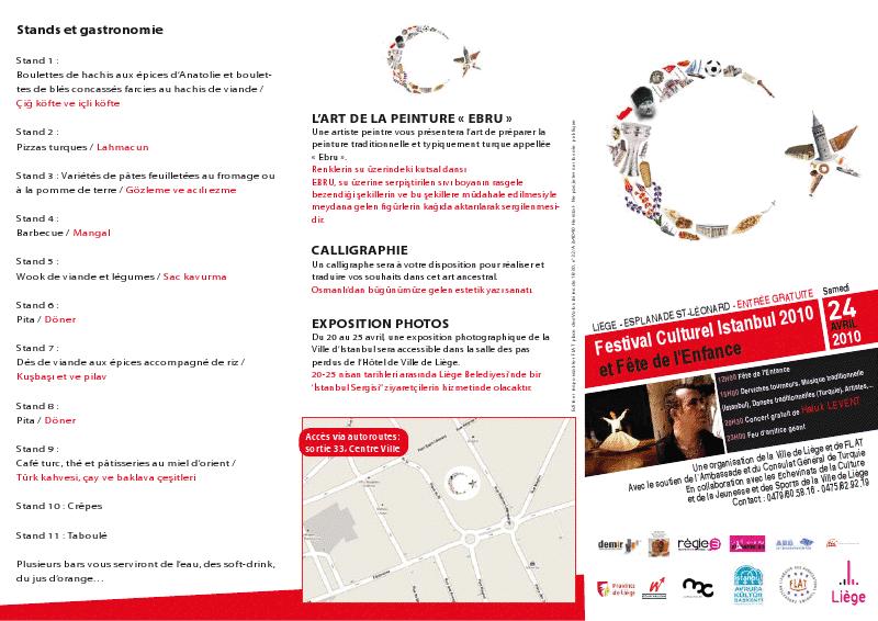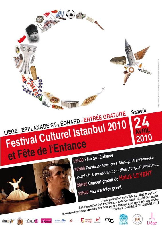 Liège Türk Dernekleri Federasyonu (FLAT), geleneksel hale getirdiği yıllık Türk Festivali serisinin üçüncüsünü, 24 Nisan Cumartesi günü, Liège Esplanade Saint Léonard Meydanı’nda ”Liège İstanbul 2010 Kültür Festivali” adı altında gerçekleştirecektir.