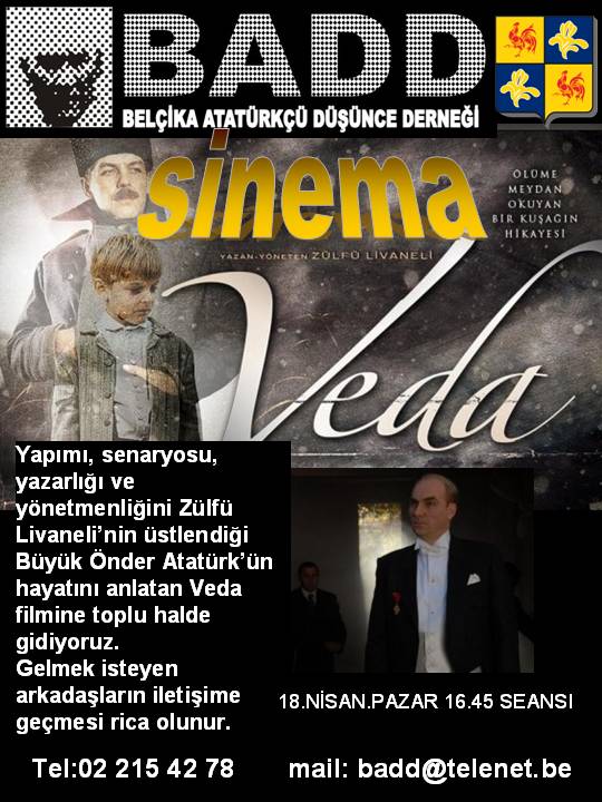 Yapımı, senaryosu, yazarlığı ve yönetmenliğini Zülfü Livaneli’nin üstlendiği Büyük Önder Atatürk’ün hayatını anlatan Veda filmine toplu halde gidiyoruz.